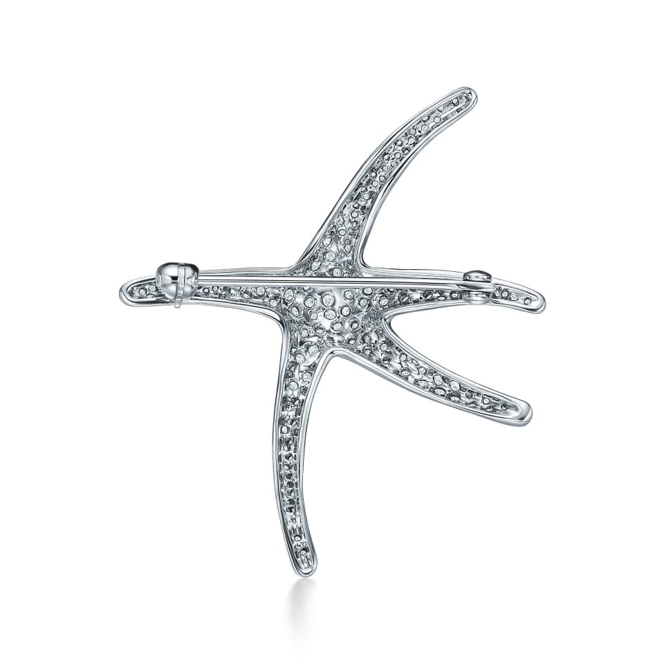 The starfish evokes life beneath the waves and in the celestial heavens. Brooch in platinum with pavé diamonds.
